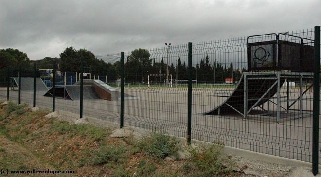 Spot à CournonsecLe spot s’étend sur une surface de 600 m². Il est situé à proximité de la piste cyclable et du stade. Il se compose d’un plan incliné, d’une table de saut avec un gros curb 3/3 (ledge) collé à une demi pyramide, d’un quarter, d’un petit rail incliné. Il semblerait que ce soit un équipement Funramp.