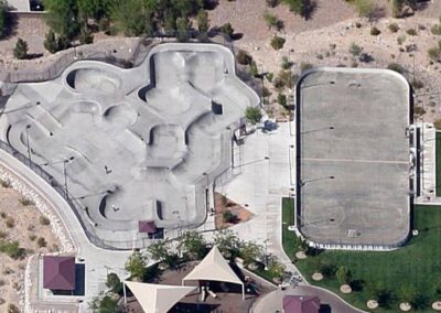Spot à HendersonA côté du skatepark d’Anthem Hills de Henderson (Nevada, USA), se trouve un terrain de roller-hockey avec des rambardes de sécurité.